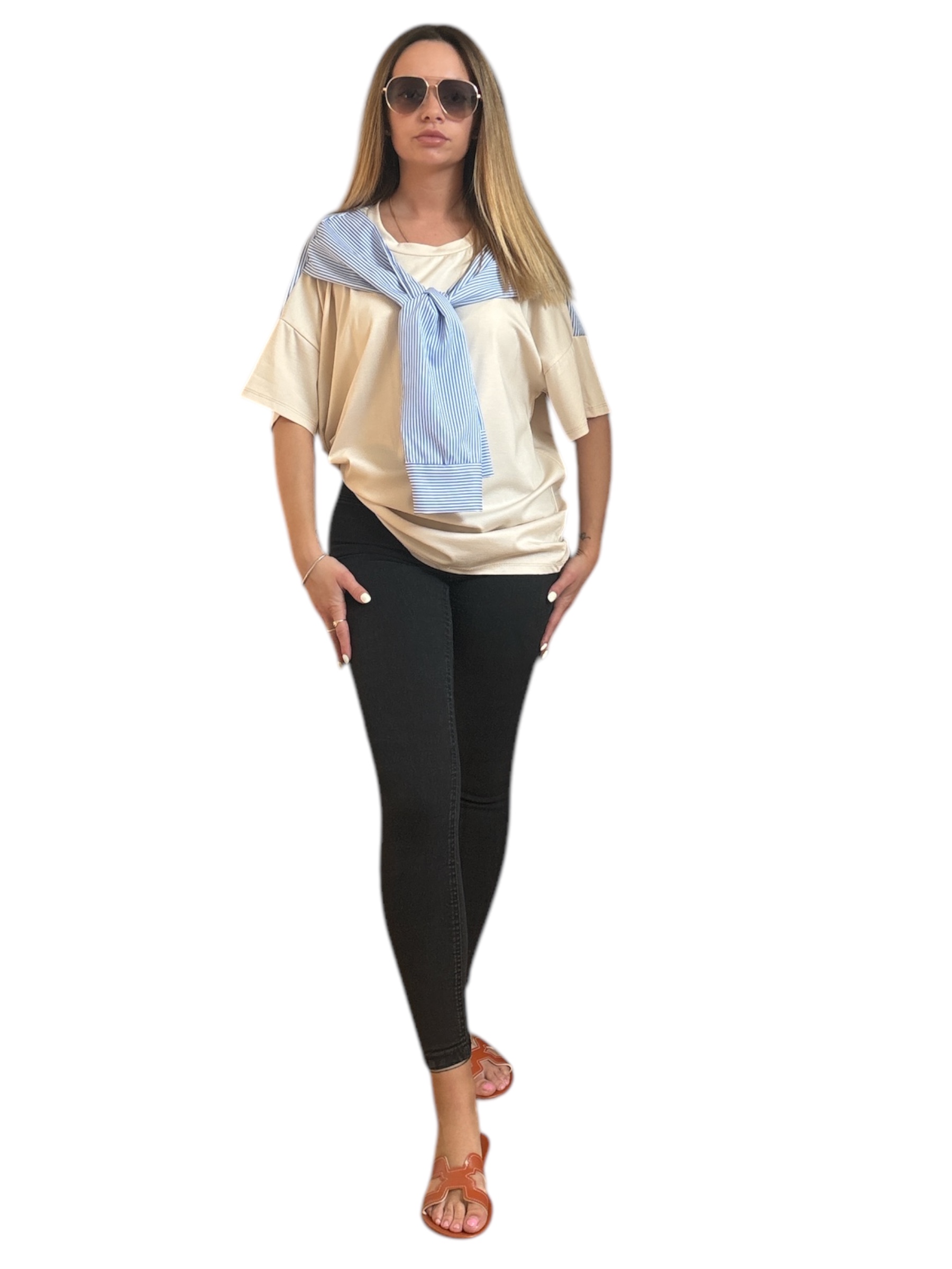 Részletek: Csíkos inghatású váll- és hátrész, elöl megköthető “ujjak”, oversize szabás