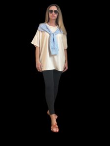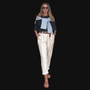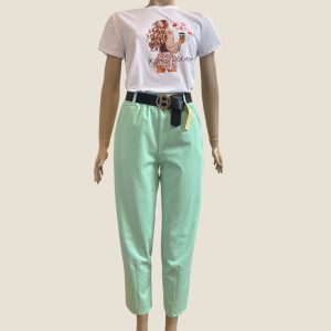 Ez az olasz szett egyszerre játékos és stílusos választás a mindennapokra! A világos, könnyed anyagból készült kantáros nadrág övvel megkötős fazonban érkezik, amely szépen formálja a derekat, a mellrészen lévő fodros hatás pedig extra nőiességet ad.